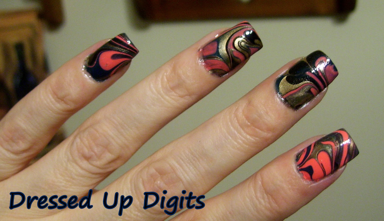 Hi Everyone! I've been toying with the idea for this water marble for awhile now. One of the gals at work was wearing a dress with black, gold, teal and coral and I thought wow these colors really look great together. I wanted to water marble a design like it. I just don't love this water marble! It had SO much potential but really fell flat for me