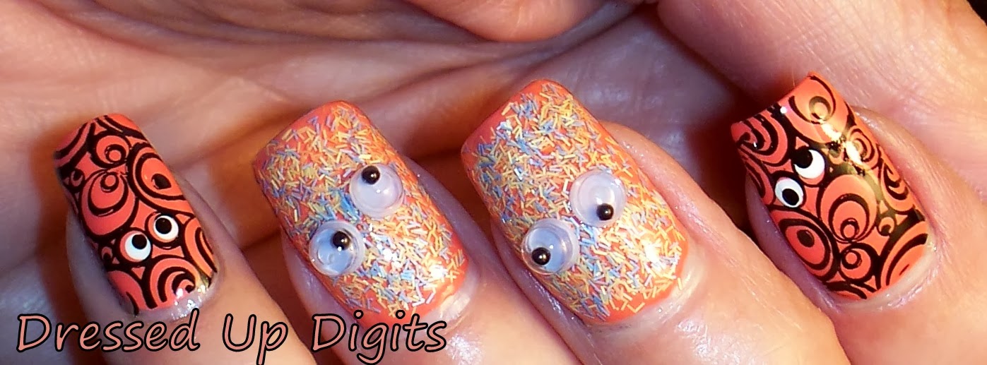 To get this looked I used Sally Hansen Snappy Sorbet and Sally Hansen Fuzzy Coat in All Yarned Up on my accent nails with some googley eyes--an idea I saw over on LacqLustre. And the rest of my nails are done in Snappy Sorbet and stamped with Konad m65. This is the cute idea Donna did! I had to double stamp thumbie but this image is pretty forgiving when double stamping.