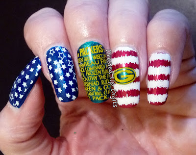 I used Zoya Song and Giovanni for my blue and green and OPI Wocka Wocka for my red. Some Dashica SdP and FUN stamping along with my custom Packer plate with Mundo White and Yellow